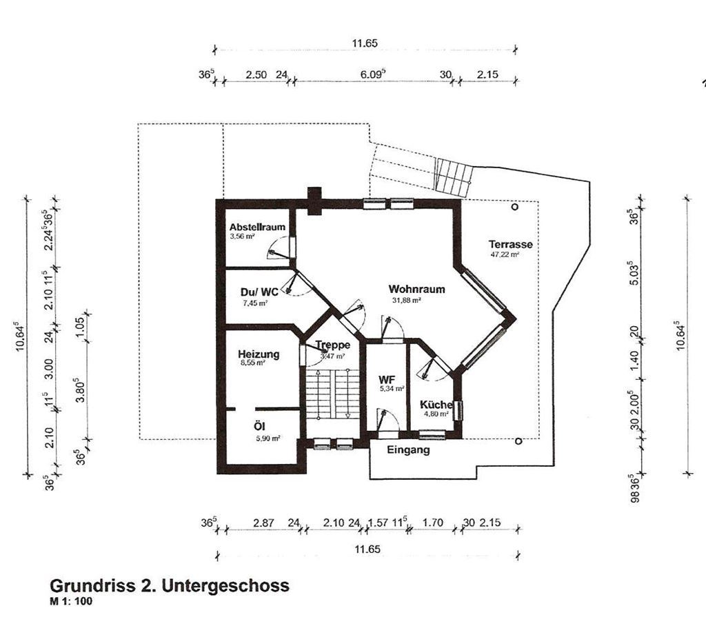 Die Einliegerwohnung befindet sich im Untergeschoss und misst ca. 64,75 m². Sie ermöglicht flexible Lebensformen, Wohnen mit Nähe zu den Liebsten oder wertvollen zusätzlichen Wohnraum für Gäste, ein Home-Office oder eine Vermietung als zusätzliche Einkommensquelle. Sie bietet einen offenen Wohn- und Schlafbereich, einen Abstellraum, ein Badezimmer mit Dusche sowie eine kleine Küche. Von hier gelangen Sie auf die große Terrasse, die auch von oben aus dem Wohnzimmer des Haupthauses zugänglich ist, und von dieser aus weiter in den Garten. Der Garten erfordert derzeit eine liebevolle Pflege, bietet aber enormen Gestaltungsspielraum – ideal, um Ihre grüne Vision umzusetzen. Terrassenähnliche Stufen im Hang schaffen ebene Flächen zur Nutzung. Ganz unten am Grundstück befindet sich eine Gartenhütte mit zusätzlicher überdachter Fläche zur Lagerung von Holz.